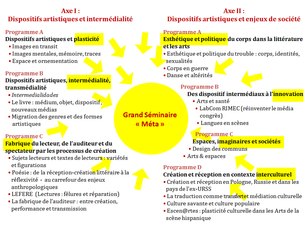 Notre programme scientifique s’articule autour de deux axes : l’un orienté vers la recherche incorporant l’exploration des approches conceptuelles que sont les dispositifs artistiques et l’intermédialité, et l’autre ouvrant sur la mise en regard dialectique et politique des dispositifs artistiques et des enjeux de société. Chaque axe, organisé en programmes transversaux, accueille une orientation fondamentale et une orientation « finalisée », étant entendu que la valorisation des produits de la recherche vers les mondes sociaux, économiques et culturels rétroalimente concrètement la recherche académique elle-même, en proposant une actualisation de ses problématiques.
